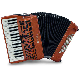 Accordéon chromatique PIGINI à 2 voix 30 touches/ 2 voix/ 72 basses Finition bois Main droite : 30 touches à 2 voix du Sol au Do 3 registres Main gauche : 72 basses standard à 4 voix Poids : 6 Kg