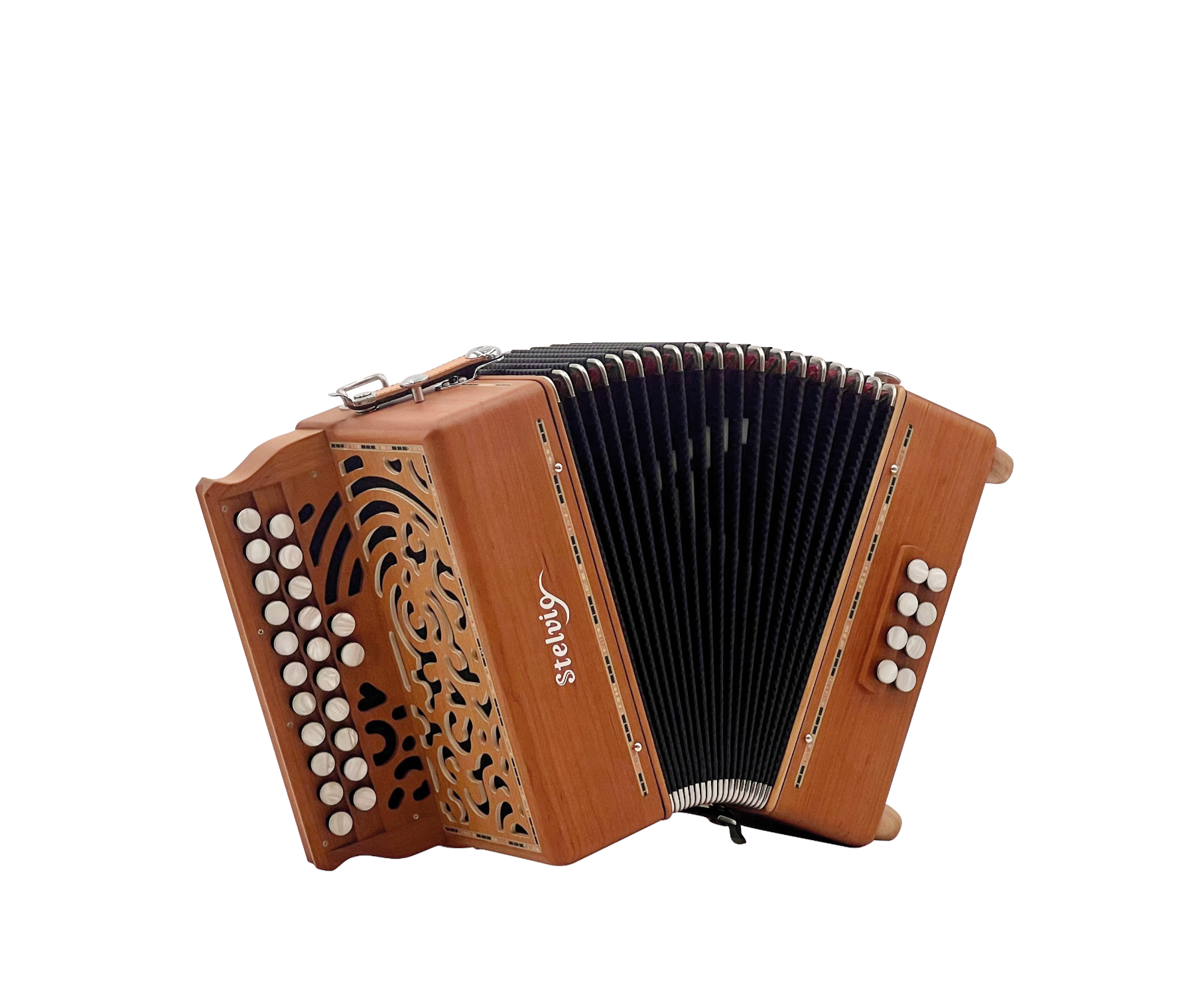 | Nb Rangées | Nb Boutons | Nb Voix | Qualité Anches | Registres | Sonorités | Nb de Basses | Registres | Taille cm | Poids Kg | Caisse bois Massif |